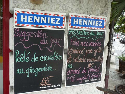 La carte du restaurant Indochine à Lausanne offre un panorama étendu d’une cuisine vietnamienne basée sur les épices et les herbes fraîches. A midi, outre un assortiment de potages bien remplis, trois plats du jour entre 16 et 18 francs sont proposés avec différentes garnitures à choix. Ils se transforment en « menu » avec une petite entrée. Celle-ci se compose de ravioli baignés dans une sauce qui procure fraîcheur et croquant à l’ensemble. Le Bun Heo continue sur la même veine de fraîcheur qui mélange croquant et de tendresse. L’émincé Tu Xuyen fait lui sentir chaleureusement en bouche la puissance et le parfum de ses épices.