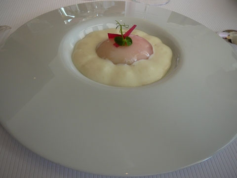 La carte offre une étendue du répertoire d’Anne-Sophie Pic avec des plats qui mêlent la créativité à une touche de produits locaux. Deux menus à 330 et 240 francs sont proposés, complétés à midi en semaine par un menu de déjeuner à 75 francs que nous choisissons. Parmi les amuses bouches, je distingue à mon goût une extraordinaire bouchée mêlant betterave et foie gras. L’entrée se compose d’un « simple » oeuf mollet pondu du côté de Villars. Celui-ci s’accorde délicieusement avec ses multiples accompagnements que l’on savoure sans qu’un mélange des matières ne brouille les goûts particuliers. Le poisson qui suit est resté tendre à la cuisson, accompagné de gnocchis et de petits légumes, le tout relevé par une sauce que tous les convives ont saucé avec plaisir. Enfin, le dessert a proposé un intéressant contraste entre les moelleux de la fraise (fraîche et en sorbet) avec la partie mêlant biscuit et chocolat.