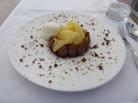 * Sablé chocolat, ananas caramélisés, sorbet citron vert
