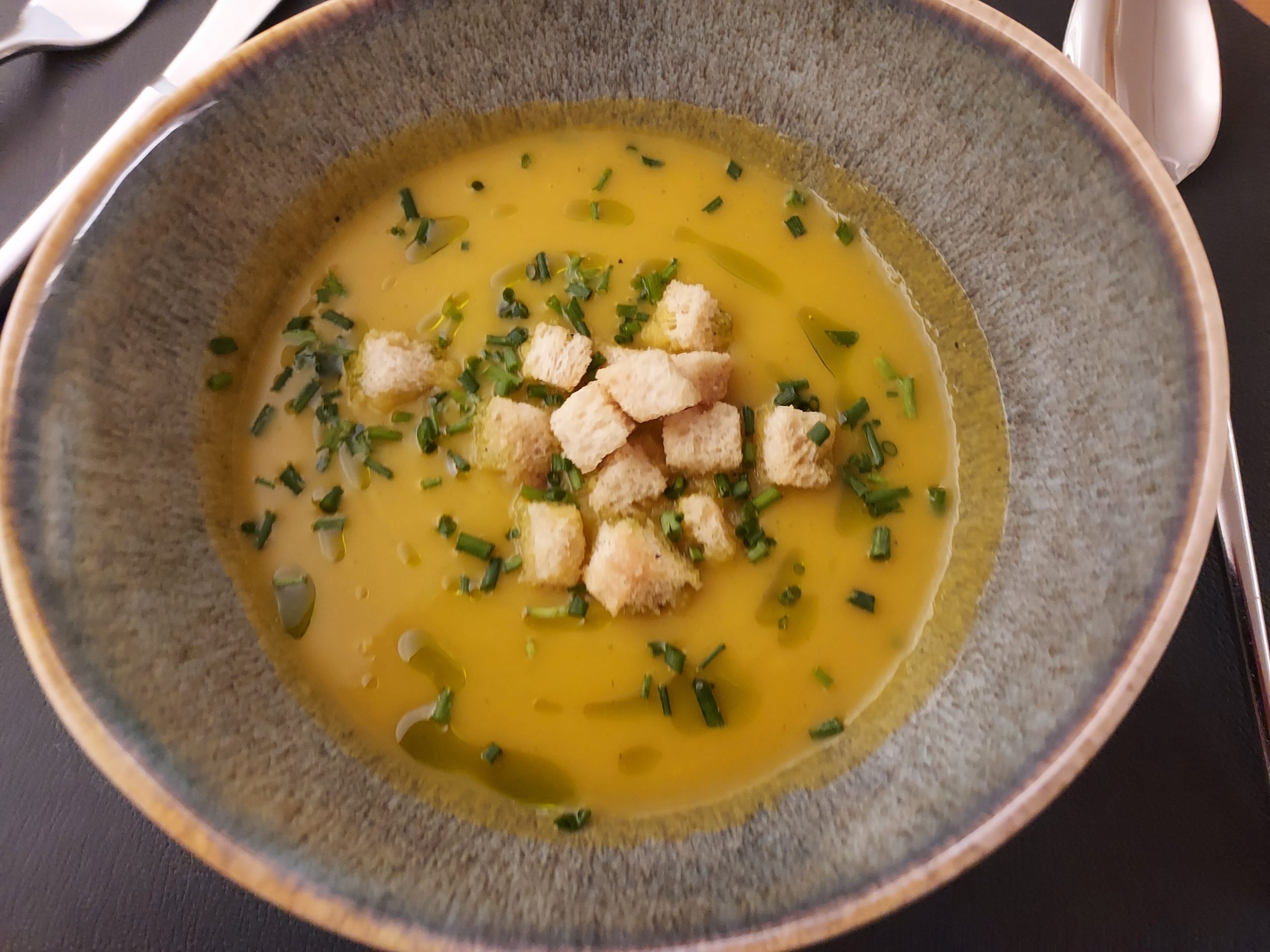 J’ai entamé mon repas avec une soupe aux herbes fraiches qui permettait déjà de faire connaissance avec l’excellent pain. Un saumon moelleux constitue mon plat principal. Sa sauce aromatique élégante est laissée sur la table pour compléter le dosage selon mon désir. Mention très bien pour le risotto et les légumes qui constituent la garniture.